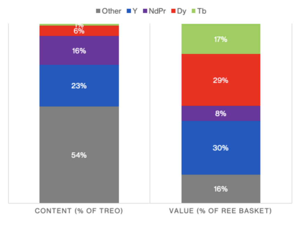 As shown in Figure 3, the rare earth basket at HsB is enriched in heavy rare earth elements (HREEs), including Dy, Tb, and Y. This heavy-rich profile differentiates hard- rock AMD from many traditional rare earth resources dominated by light rare earth elements and aligns closely with U.S. defense and advanced manufacturing priorities.
